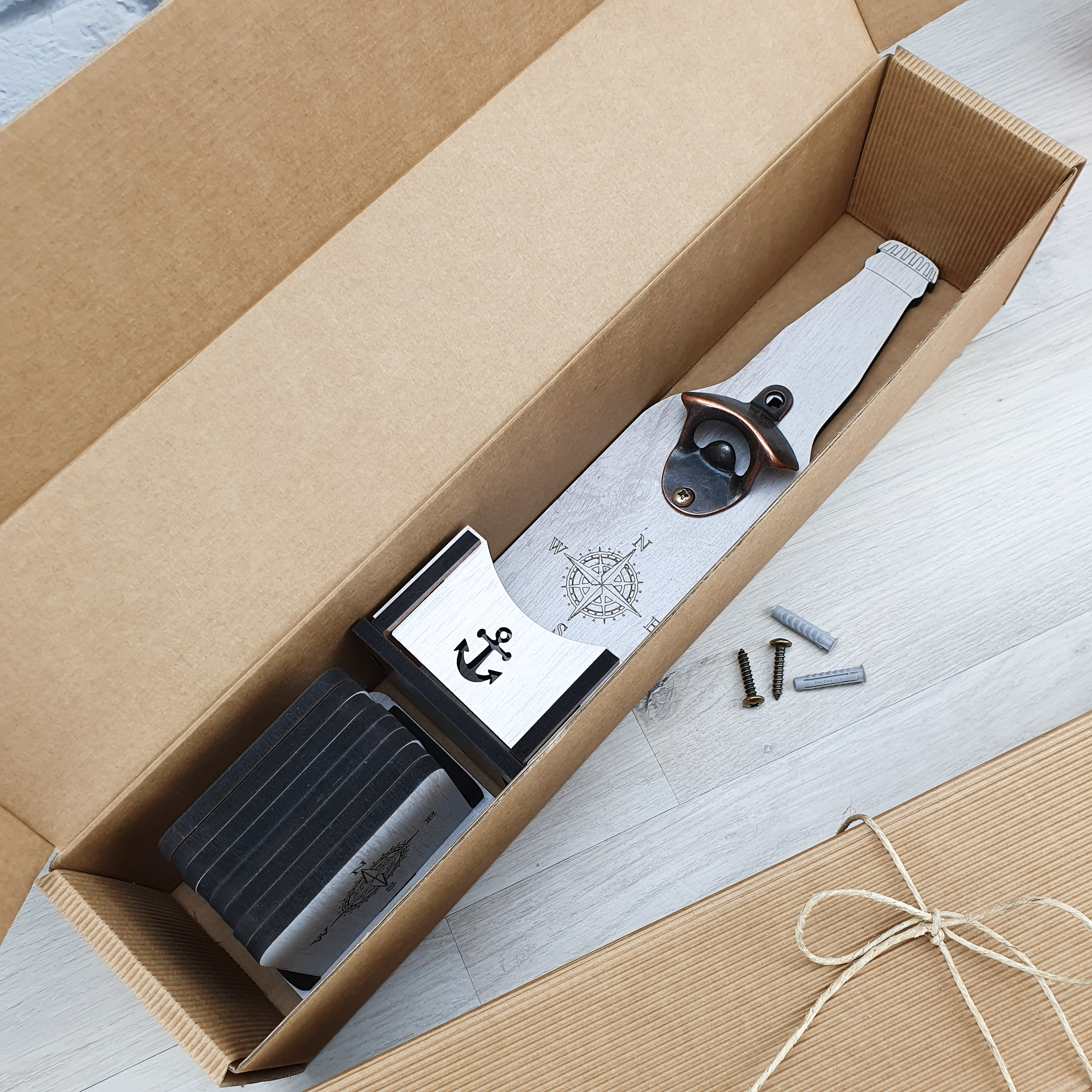 Apribottiglie da muro con sottobicchieri grigio chiaro “rosa dei venti”