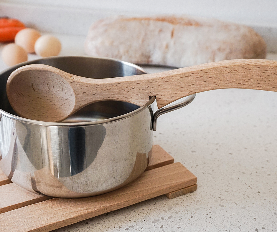 Cucchiaione pensato per essere appoggiato comodamente sul bordo della pentola, per averlo sempre a portata di mano, senza sporcare la cucina.